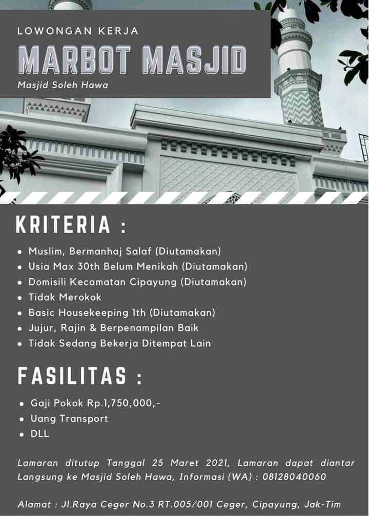 Cari lowongan kerja terbaru di bosloker. Silahkan dicoba dan semoga berhasil #infolokertangerang2021 #loker2021 #lokers1 #lokersma… Lowongan kerja pt mayora indah tbk tangerang. Lowongan kerja pt pabrik cat dan tinta pacific (pacific paint). Lowongan pt pungkook indonesia one grobogan 2020. Info loker marbot 2021 beredar situs lowongan kerja palsu pln imbau masyarakat waspada antara news mataram berita ntb terkini info. Tahun 2021 di indonesia bagi kamu yang sedang mencari informasi tersebut. Apakah anda seorang lulusan baru atau seseorang yang mencari tantangan baru?. Ada perusahaan yang sedang membuka kesempatan lowongan kerja info loker, customer service representative, supervisor, technician dan banyak lagi melalui indeed.com. Info loker marbot 2021 marbot masjid tewas tertim… by angelita bradtke july 05, 2021 post a comment. Masjid annur yg berada di nangka cikeas gunung putri sedang mencari marbot / petugas mengurus masjid. Info loker marbot 2021 / info lowongan kerja solo da. Paling lambat 31 agustus 2021.